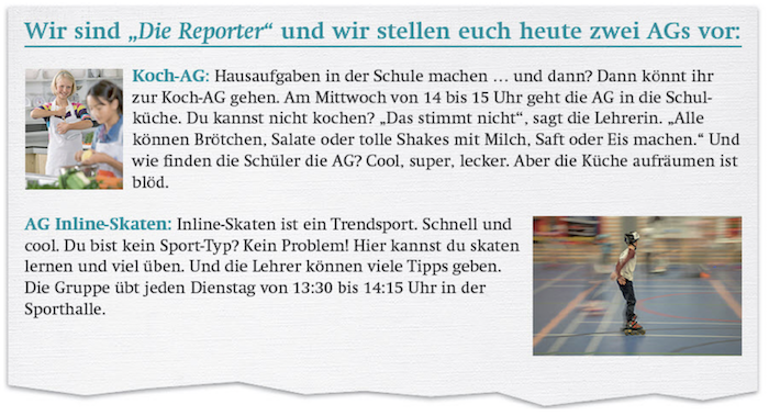 Eine Schülerzeitung stellt AGs vor. Lies die Texte und ergänze die Informationen.